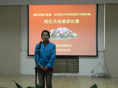 ??????? 為深入學習貫徹利達公司2013年經營工作會議精神,進一步明確發展目標,統一全員思想,激發傳播正能量,推動公司自我變革活動,在春暖花開、充滿希望的季節,利達光電黨總支舉辦“激發傳播正能量,為完成公司2013年經營目標做貢獻”演講比賽活動。