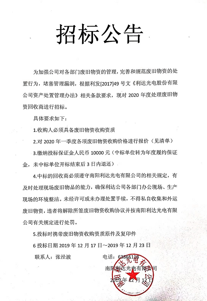 - (2025-07-17)利達光電公開招聘財務部部長擬錄用人員公示