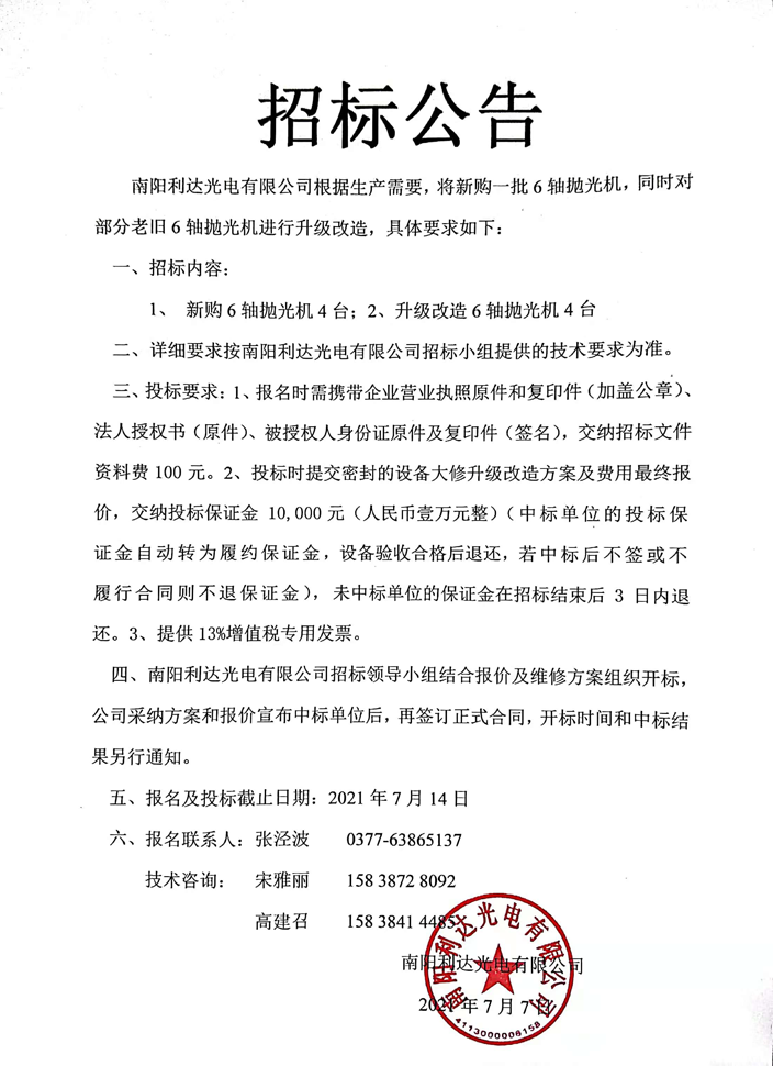 棱鏡事業(yè)部新購及升級改造6軸拋光機招標(biāo)
